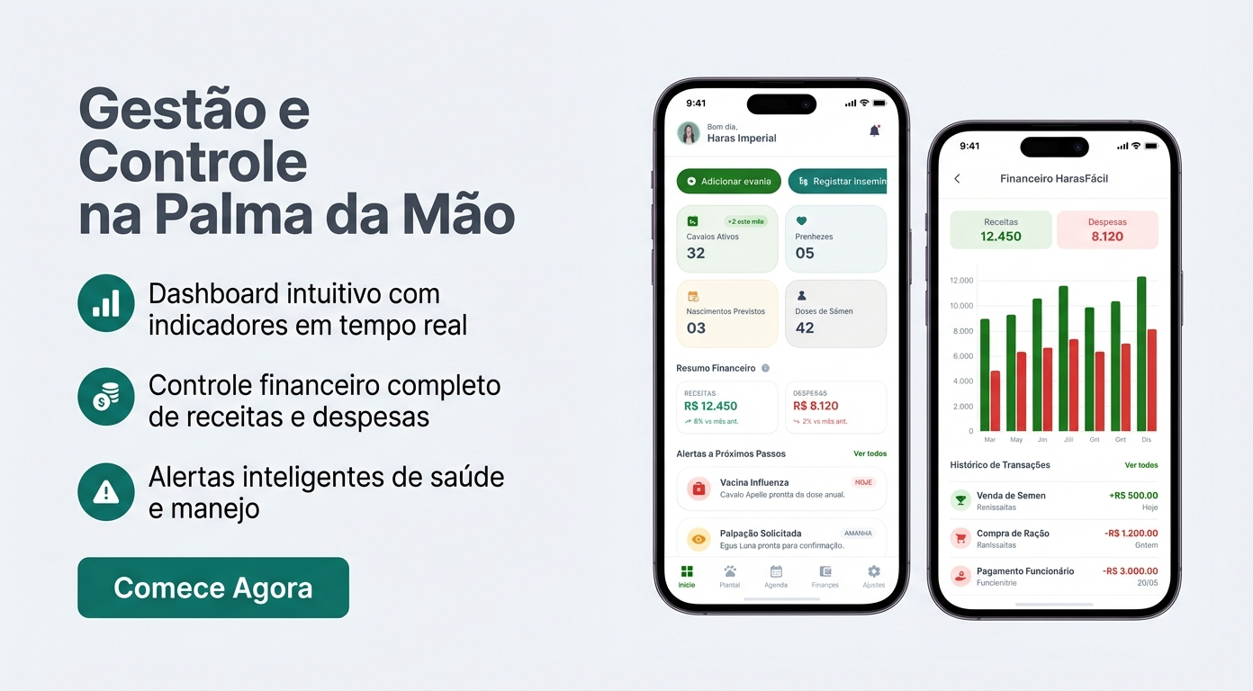O Haras Fácil foi criado para quem ama a lida, mas vive sem métricas. Com ele, você mantém tudo em dia: plantel, reprodução, vacinas, vendas e finanças — sem complicação.